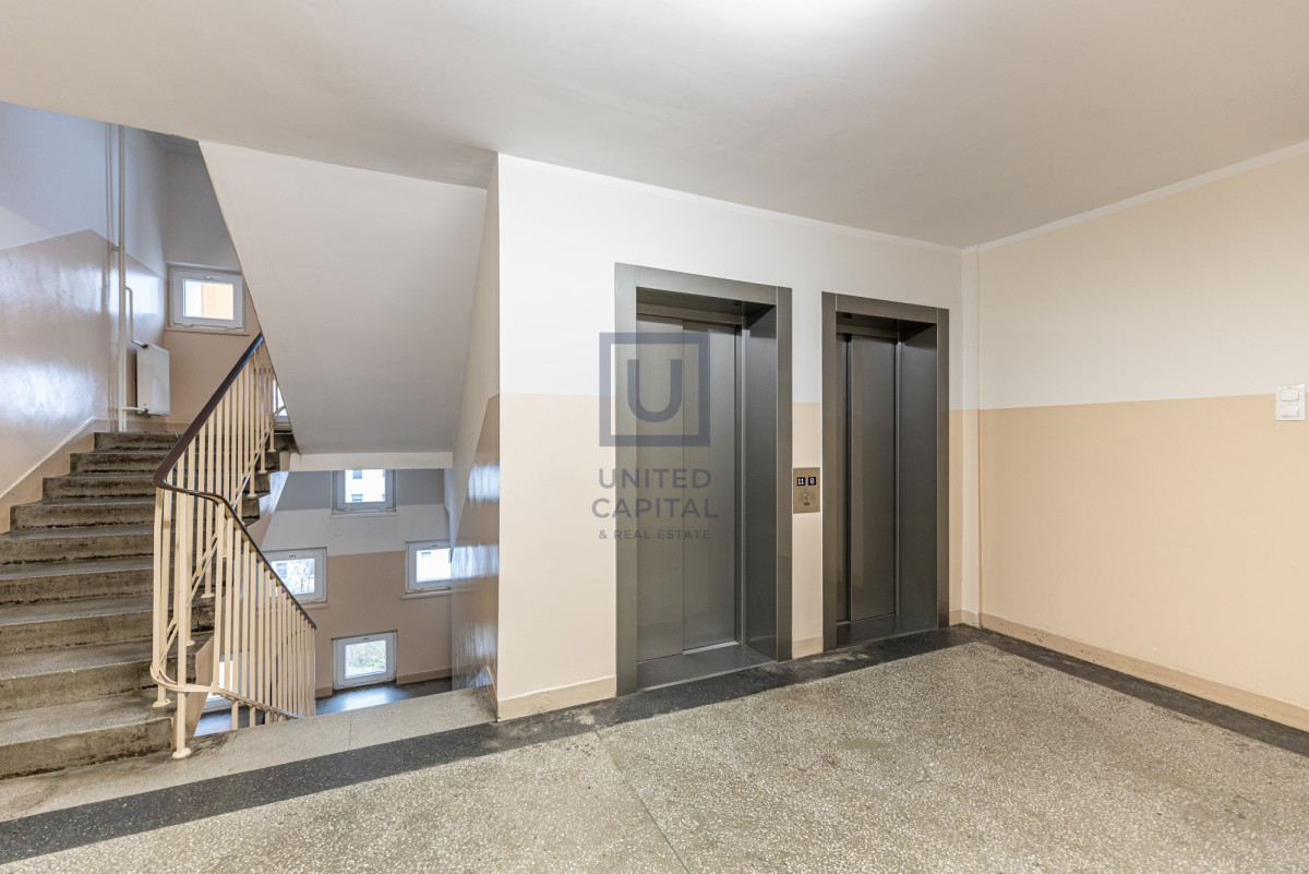 W bloku znajdują się dwie windy a do dyspozycji mieszkańców, minutę od wyjścia z klatki do dyspozycji duży parking w postaci miejskiej strefy parkowania.