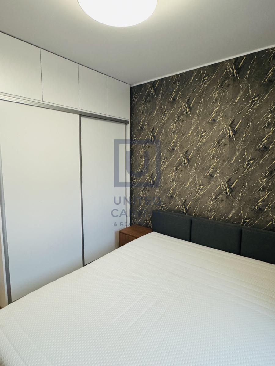 - Sypialnia z podwójnym łóżkiem, oraz szafą w zabudowie.