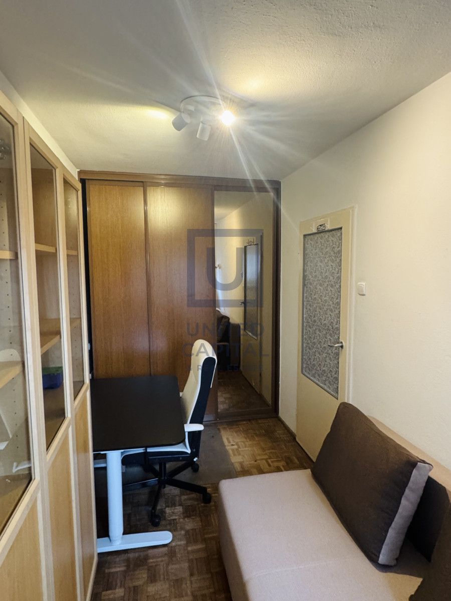 - Sypialnia z zabudowaną szafą, biurkiem oraz rozkładaną kanapą.